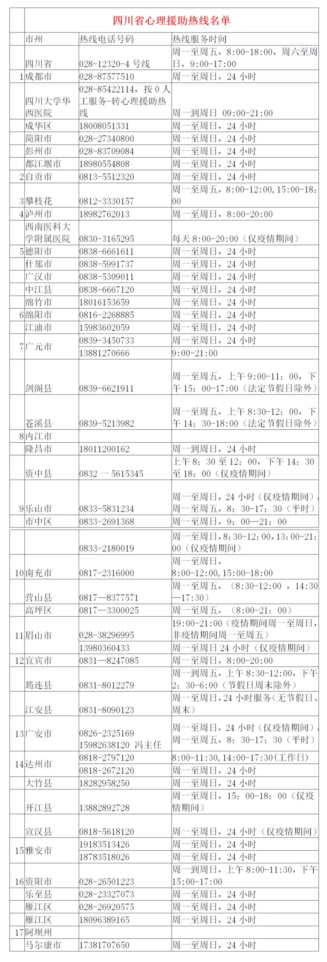 四川省各地心理援助热线
